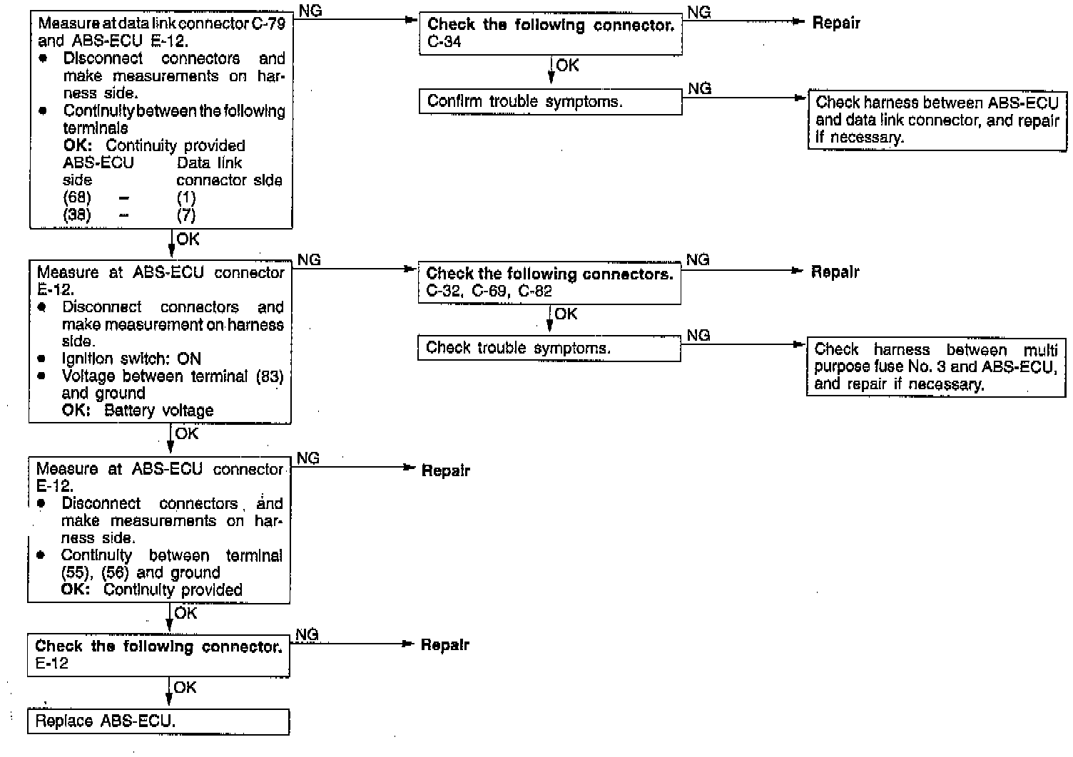 When communication with the scan tool is not possible, the cause is probably an open circuit in the ABS-ECU power circuit or an open circuit in the diagnostic output circuit.