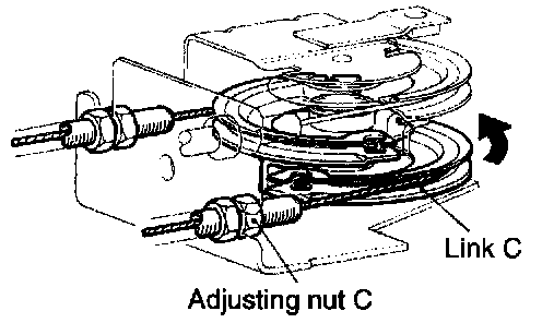 (4) Rotate intermediate link C in the direction shown until it is blocked by the stopper, turn down adjusting nut C in the direction that the free travel of the inner cable is reduced and back off adjusting nut C the specified number of turns just before intermediate link C begins to move.