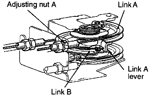 (9) Turn down adjusting nut A in the direction that the free travel of the inner cable of the cruise control cable is reduced. At the p0siti0n where the lever of a intermediate link A is brought into contact with intermediate link B, back off adjusting nut A the specified number of turns.