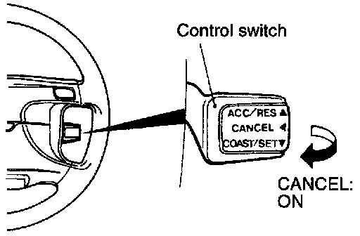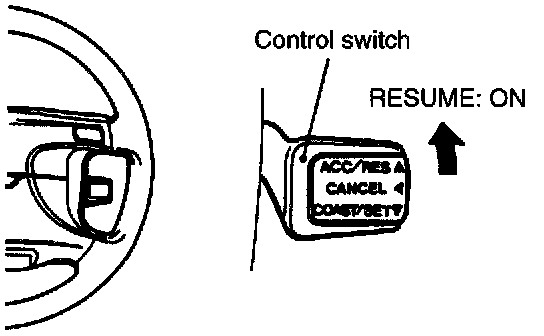3. With the vehicle at a speed of more than about 40 km/h (25 mph), check that when the control switch is moved upward (RESUME switch: ON), the vehicle resumes cruising at the speed held before cancellation of the cruise control mode.