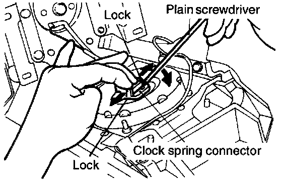 b. Remove the air bag module. To remove the clock spring connector (squib connector) from the air bag module, force the lock outward and pry it with a plain screwdriver as shown at left so that no undue force will be exerted on the connector when it is removed.