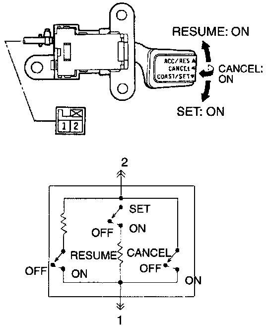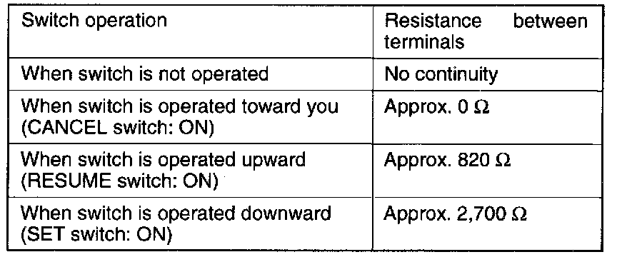 WARNING: The capacitor in the SRS-ECU retains enough voltage to deploy the air bag for a given period even after disconnection of the battery. If an operation is performed during that given period, unintended deployment of the air bag could result and cause serious injury.CRUISE CONTROL SWITCH CHECK