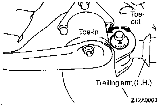 To adjust toe, turn the assist link mounting bolts (on crossmember side) on both sides the same amount.