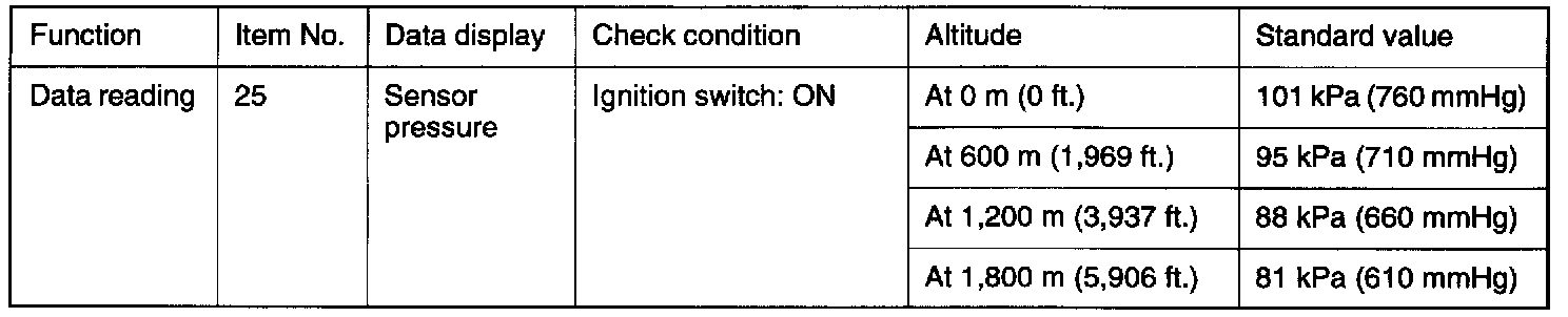 - If the pressure indication of the barometric pressure sensor drops significantly during high speed driving, check the air cleaner for clogging.