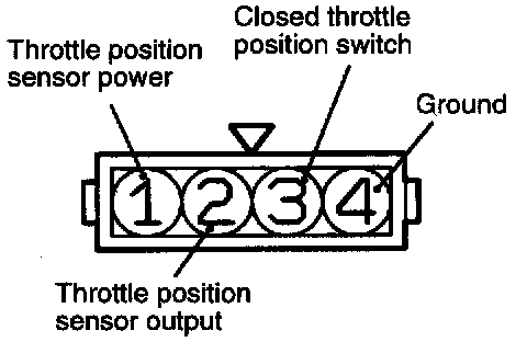 4. Check for continuity between terminals 3 (closed throttle position switch) and 4 (ground) with the throttle valve both fully closed and fully open.