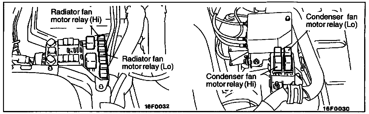 If the engine control module turns ON the high speed side power transistor inside the unit, the radiator fan motor relay (Hi) and condenser fan motor relay (Hi) will operate to send the driving power supply (for high speed rotation) to the radiator fan motor and condenser fan motor.