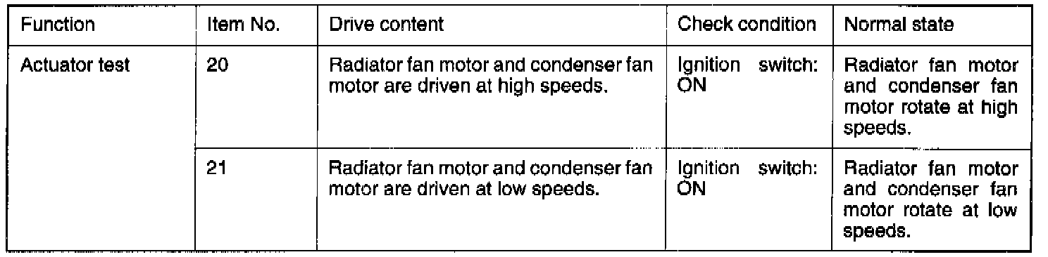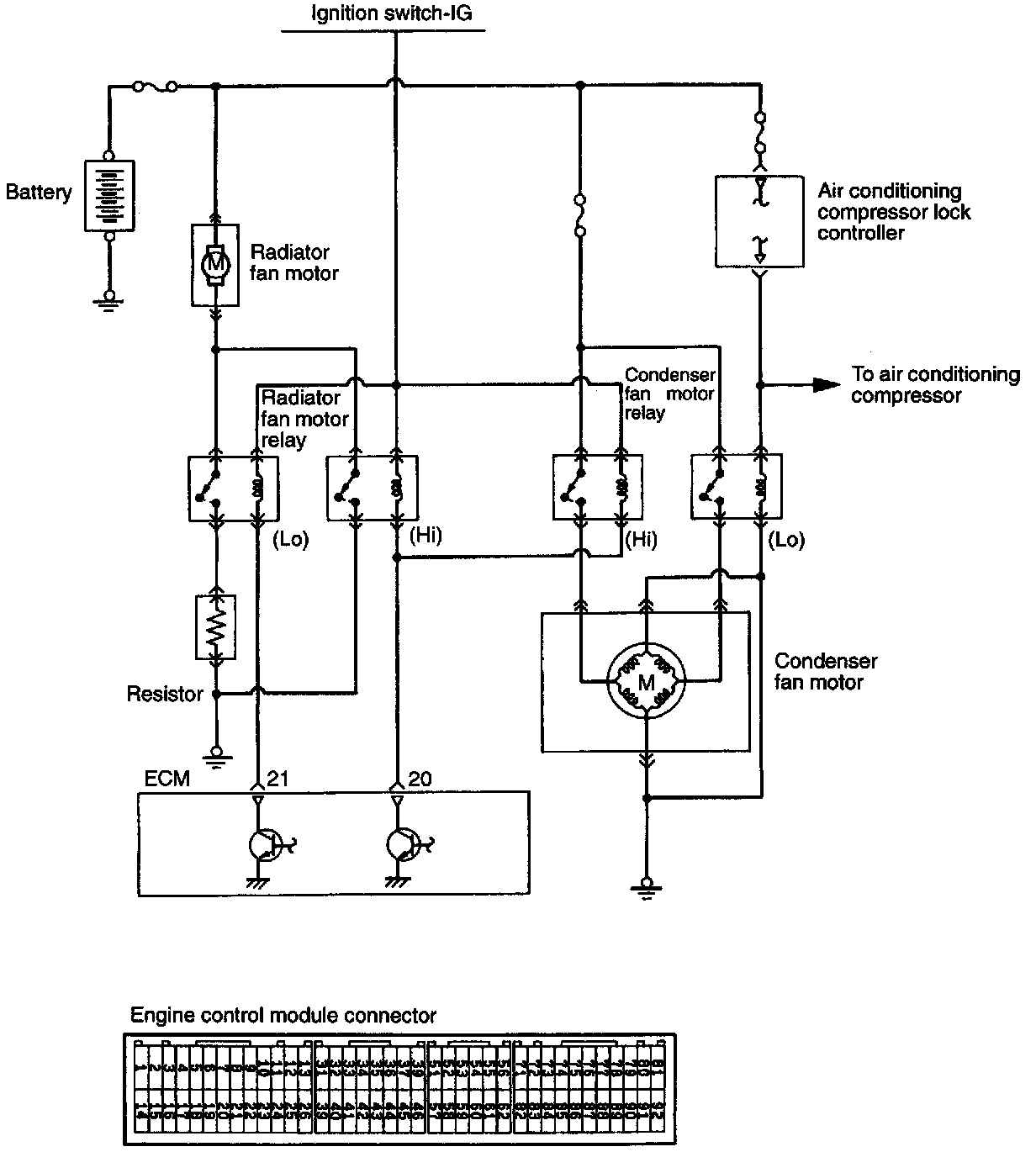 - The engine control module controls the radiator fan motor and condenser fan motor according to the engine coolant temperature and vehicle speed via the power transistors (low speed side and high speed side) in the module.