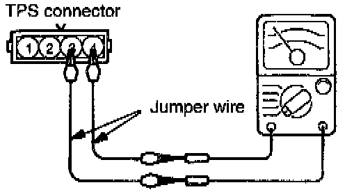 b. Using jumper wires, connect an ohmmeter across terminal (3) (closed throttle position switch) and terminal (4) (sensor ground) of the throttle position sensor.