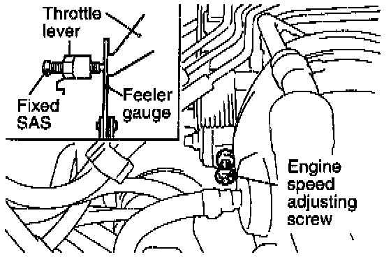 2. Insert a 0.65 mm (0.025 in.) feeler gauge between the fixed SAS and throttle lever.