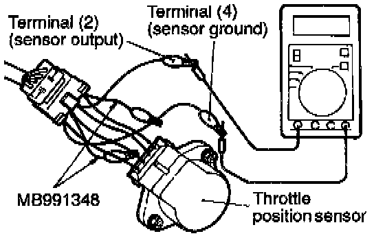b. Connect a digital voltmeter between the throttle position sensor terminal (2). (sensor output) and terminal a (4) (sensor ground).