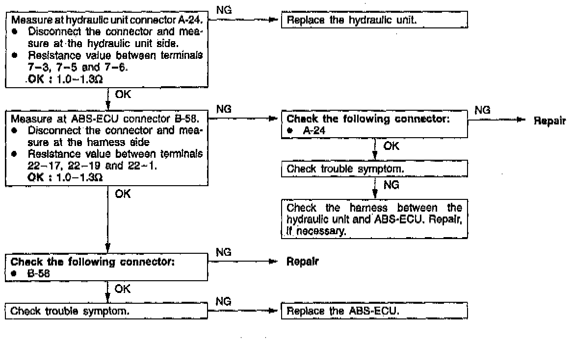 Comment: The ABS-ECU normally monitors the solenoid valve drive circuit. If no current flows in the solenoid even if the ECU hums the solenoid ON or if it continues to flow even when burned OFF, the ECU determines the solenoid coil wire is broken/short-circuited or the harness is broken/ short-circuited, and then these diagnostic trouble codes are output.