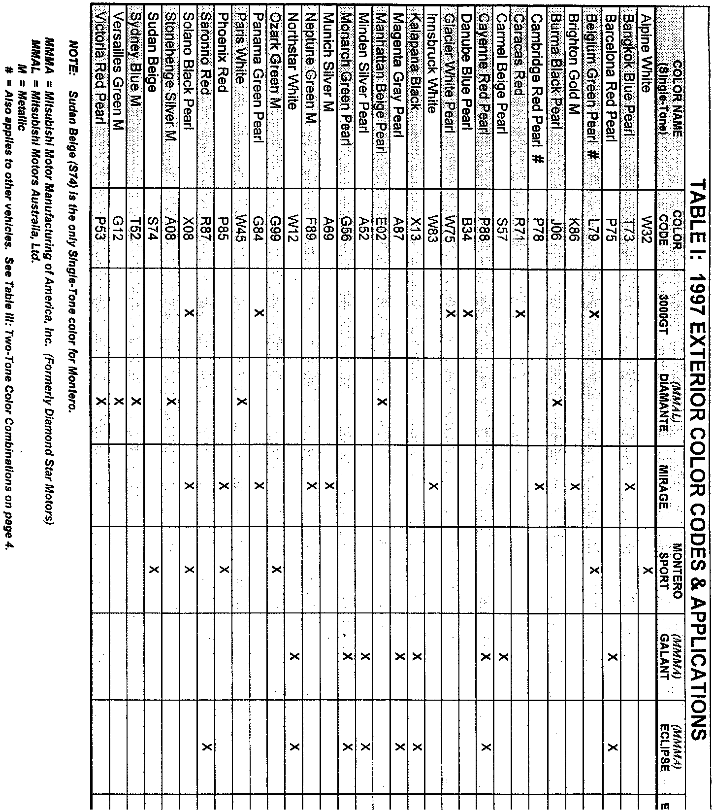 This article contains complete exterior color information on all 1997 Mitsubishi Motors vehicles.