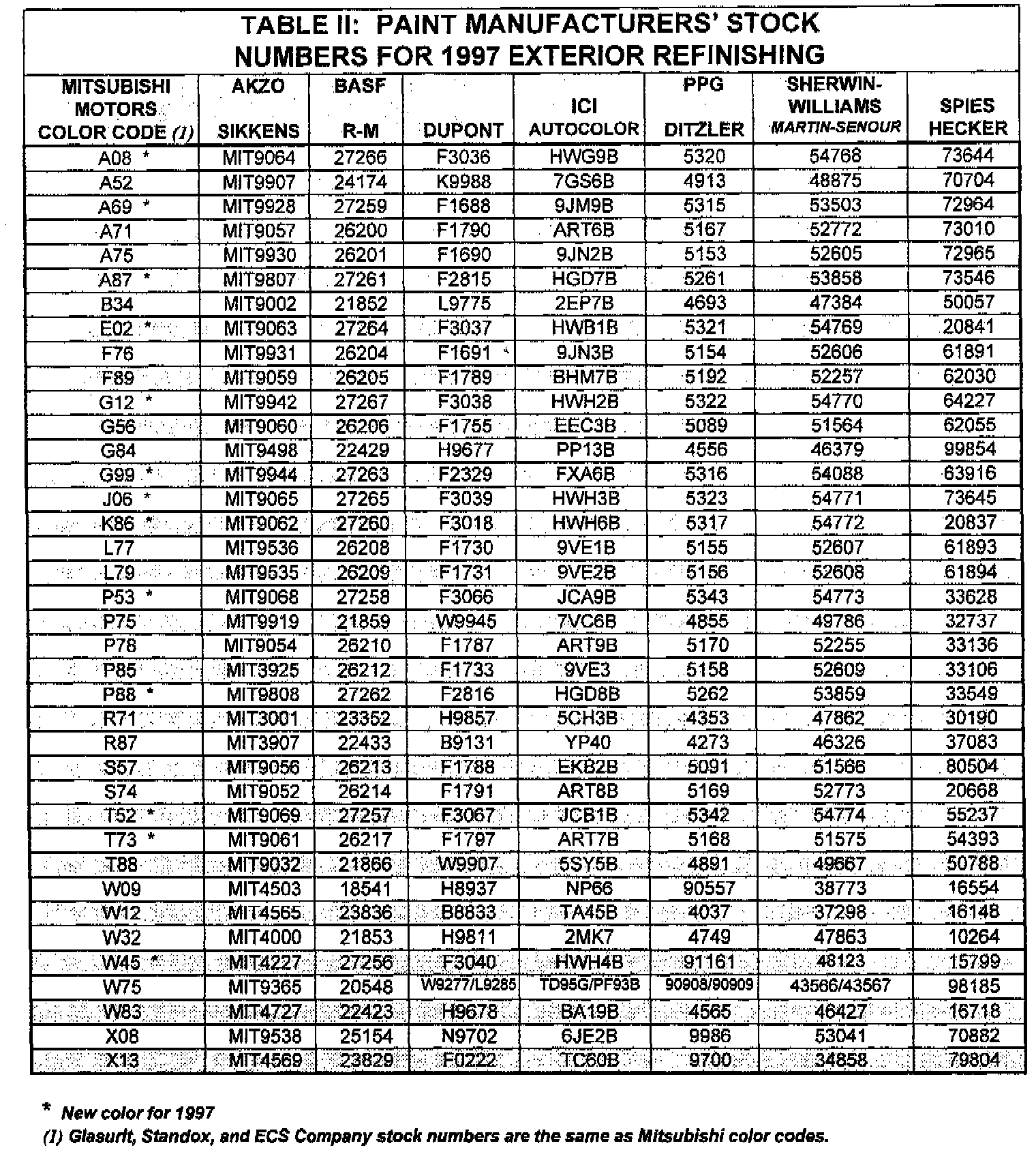 Table II contains the manufacturers' stock numbers from several automotive refinish companies, which correspond with the Color Codes and Applications shown in Table I.