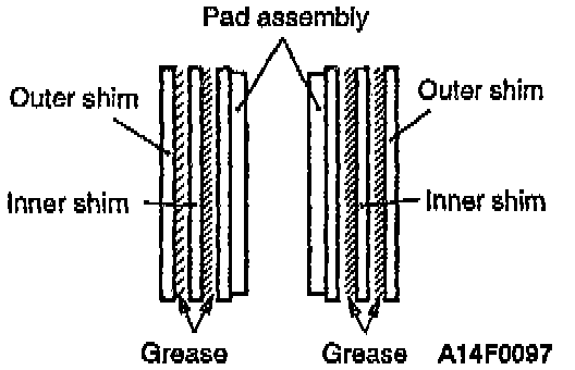 - Apply specified grease (brake grease SAE J310, NLGI No. 1) to the attaching faces of pad and inner shim and to the attaching faces of inner and outer shims. Apply so as not to spread it out from the edge of shim.