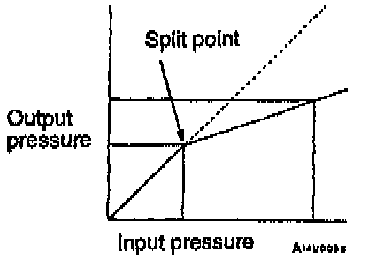 a. Output pressure begins to drop relative to input pressure (split point). The standard value is 2.70 - 3.19 MPa (391 - 462 psi).