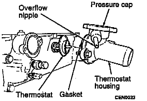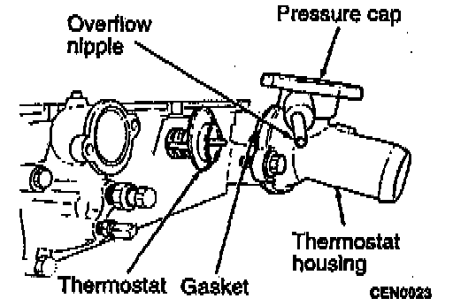 8. Remove thermostat, discard gasket and clean both gasket sealing surfaces.