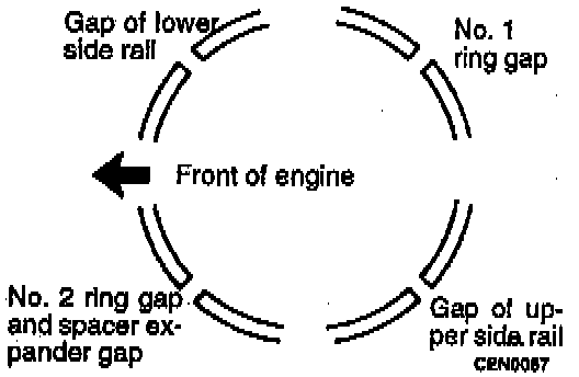 6. Position oil ring expander gap at least 45° from the side rail gaps but not on the piston pin center or in the thrust direction. Staggering ring gap is important for oil control.
