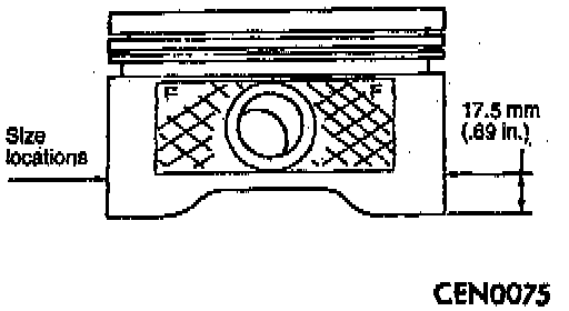 1. Piston and cylinder wall must be clean and dry. Piston diameter should be measured 90° to piston pin at size location shown in the figure. Cylinder bores should be measured halfway down the cylinder bore and transverse to the engine crankshaft center line. Correct piston to bore clearance must be established in order to assure quiet and economical operation. The standard value is 0.012 - 0.044 mm (0.0005 - 0.0017 inch)