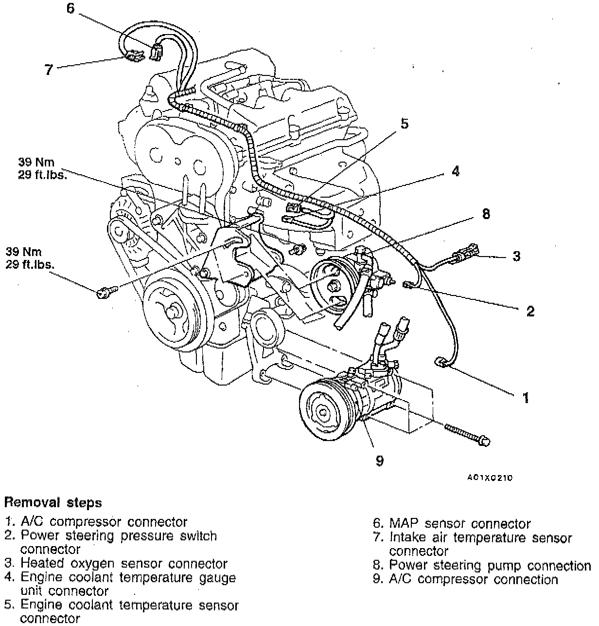 NOTE: Place the removed A/C compressor in a place where it will not be a hindrance when removing and installing the engine assembly, and tie it with a cord.