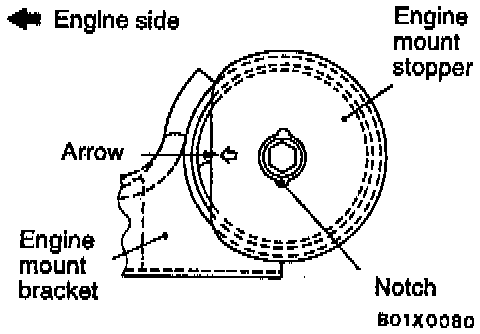 6. Align the notches on the stopper with the engine mount bracket with the arrow mark facing toward the shown direction. Then install the stopper.