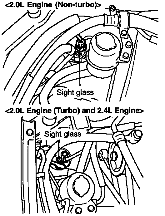 The sight glass is a refrigerant level indicator. To check the refrigerant level, clean the sight glass and start the vehicle engine. Push the A/C button to operate the compressor, place the blower switch to high and move the temperature control dial to max cool. After operating for a few minutes in this manner, check the sight glass.
