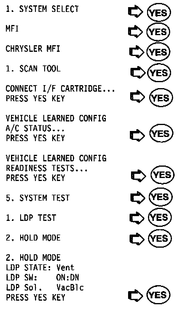 4. With the ignition key OFF, connect the MUT-II scan tool. Then with the ignition key ON (engine on), follow the MUT-II selection sequence to enter LDP Hold Mode: