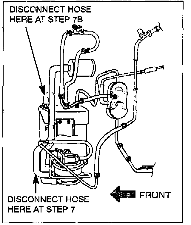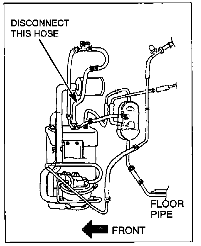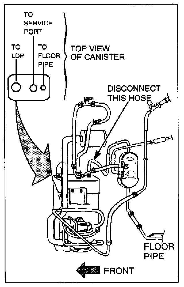 8. Remove the wheel and tire assembly and inner splash shield from the front passenger side. At the canister, disconnect the hose leading to the floor pipe.