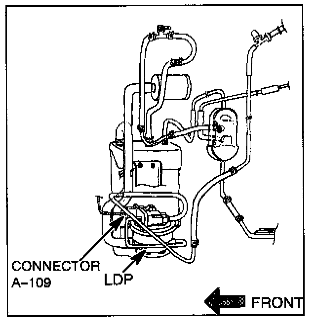 5. Turn the ignition key to OFF. Disconnect and inspect the LDP connector A-109 and its terminals. Check for corrosion, bent pins, backed-out pins, etc.