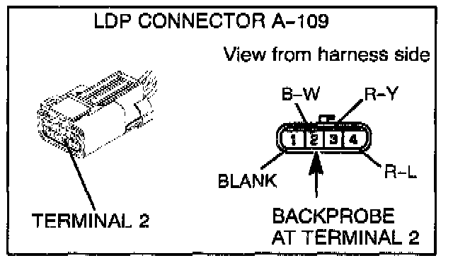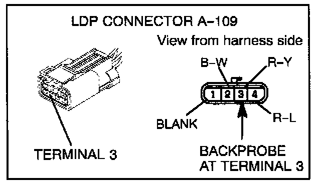 8. Using a voltmeter, test for voltage between terminal 3 (R/Y wire) of LDP connector A-109 and ground. Do not disconnect the connector. Backprobe at terminal 3.