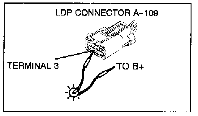 12. With the ignition key turned to ON, enter LDP Hold Mode as described in Step 6. Connect a test light to B+ and probe terminal 3 of LDP connector A-109.
