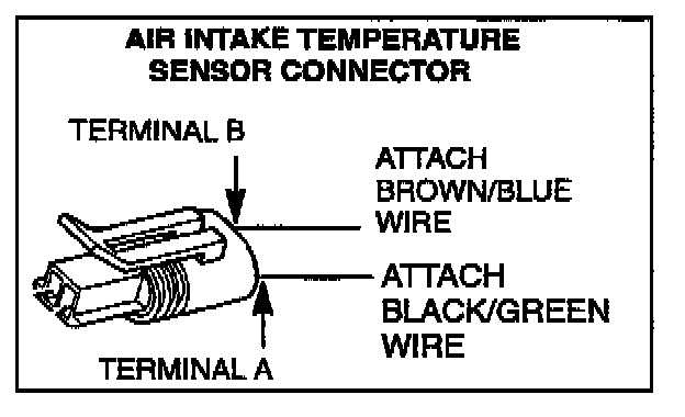 4. Solder a new connector (listed in the PARTS INFORMATION section of this bulletin) to the wiring harness. Attach the black/green wire to terminal A. Attach the brown/blue wire to terminal B.