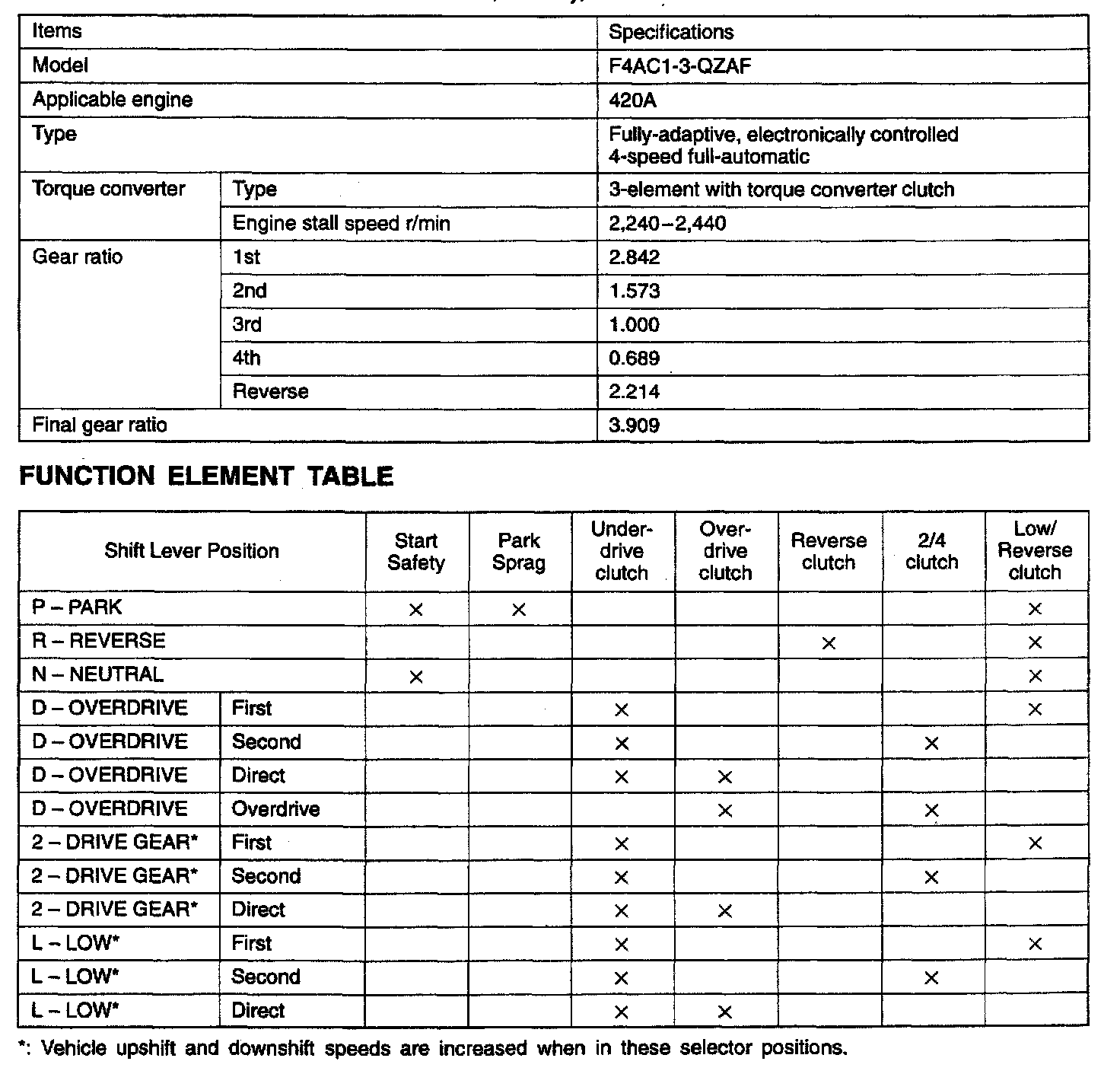 F4AC1 4-spd A/T, Gear Ratios & Upshift & Downshift Increase Chart: