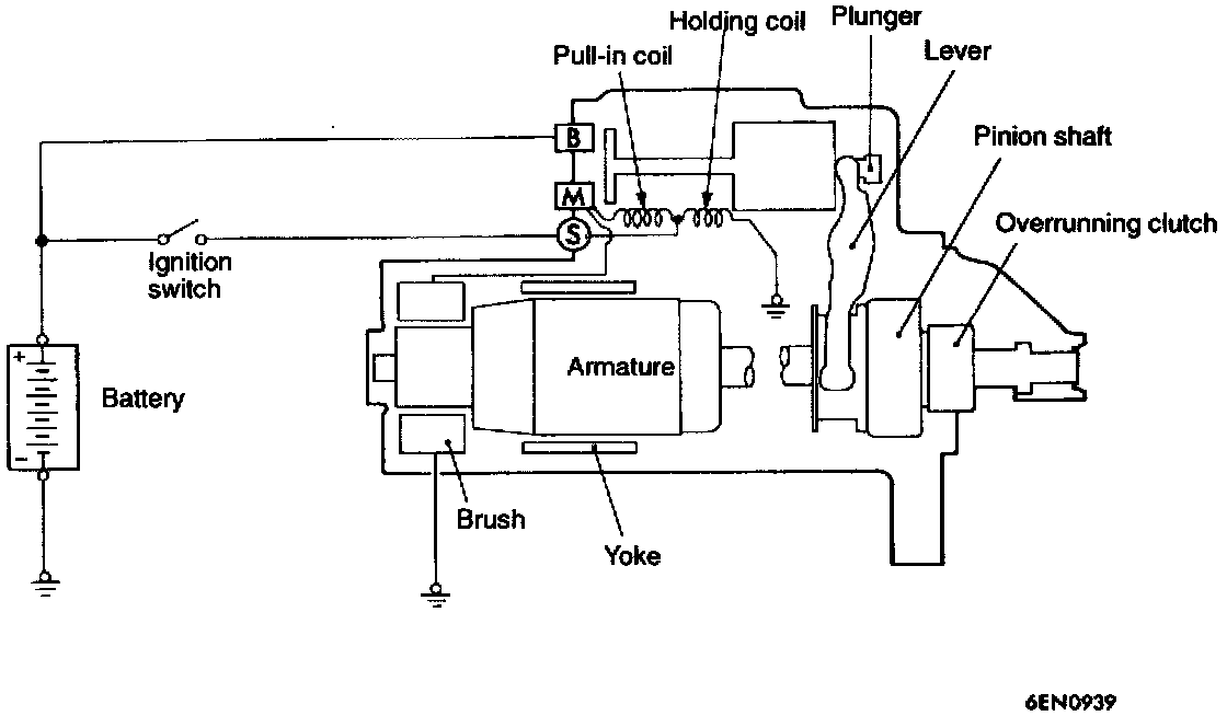 When the ignition switch is turned to the "START" position, current flows in the Pull-in and Holding coils inside the magnetic switch (starter solenoid), attracting the plunger. When the plunger is attracted, the lever connected to the plunger engages the starter clutch and completes the circuit between the "B" and M" terminals, providing current to the starter motor.