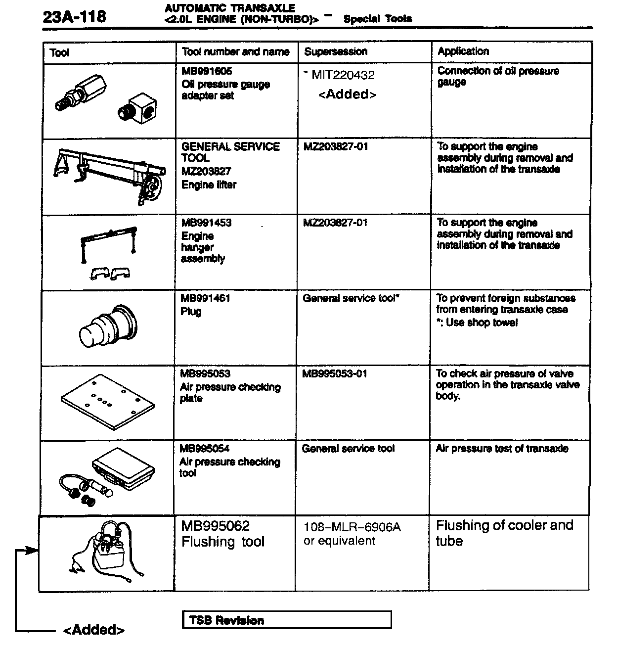This bulletin contains updates to the automatic transaxle special tool list in the 1997 Eclipse/Eclipse Spyder Volume 1 Service Manual. A new flushing tool is available and there is a new supersession part number for the oil pressure gauge adapter set.