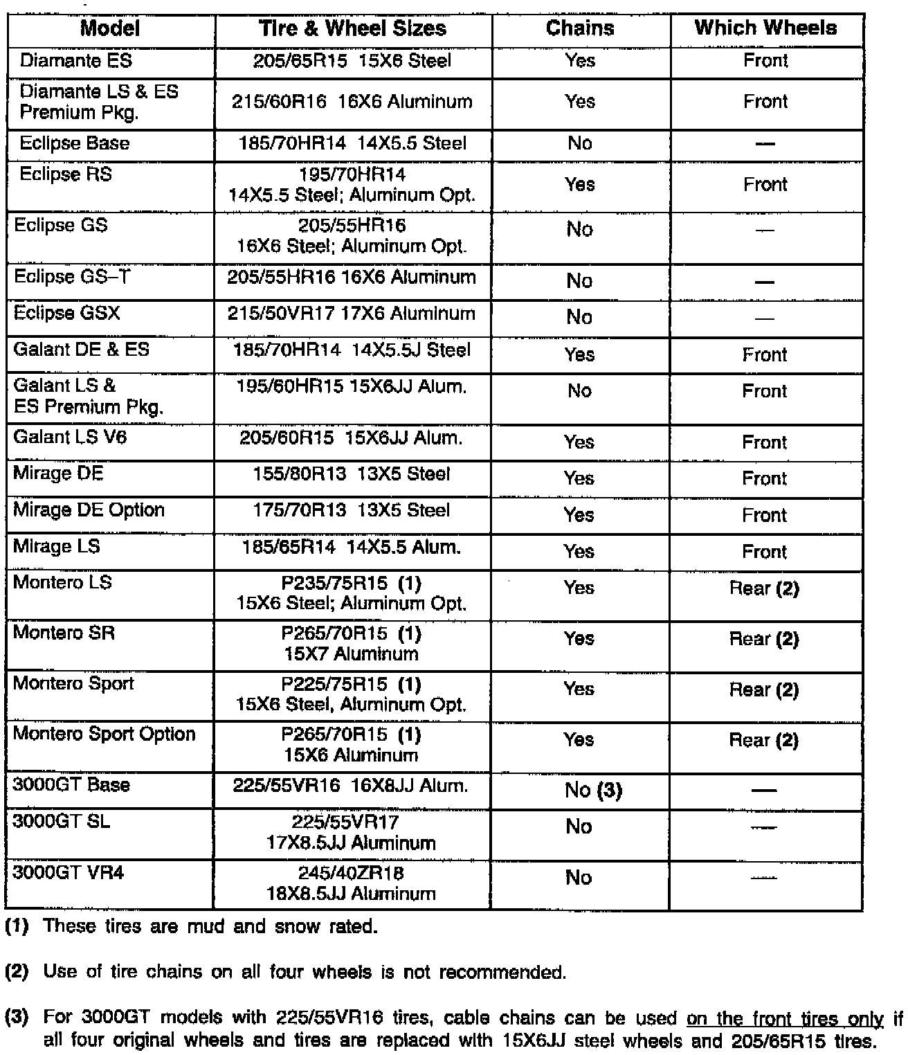 ^ Tire chains cannot be used on any 3000GT with factory equipment wheels and tires. However, on base 3000GT models, if all four original wheels and tires are replaced with 15X6JJ steel wheels and 205165R15 tires, chains may be used only on the front wheels.