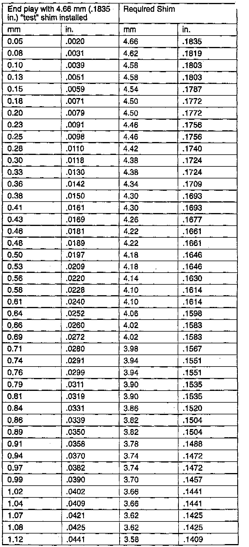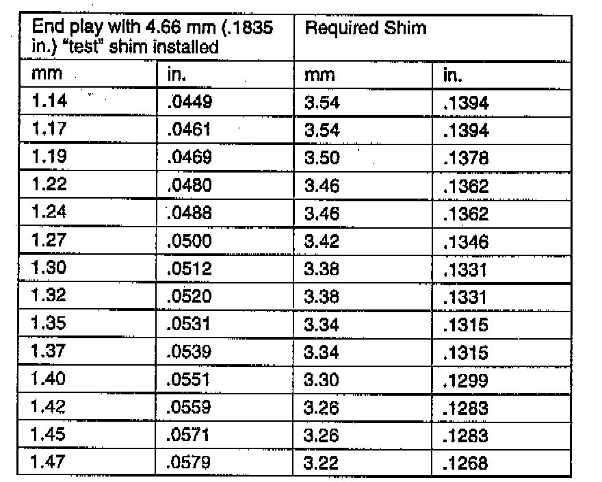 For example, if end play reading is 1.40 mm (.0551 inch), subtract end play specifications. 1.40 mm (.0551 inch) - [.13 mm (.0051 inch) to 0.64 mm (.0252 inch)] = 1.27 mm to 0.76 mm (.0500 inch to .0299 inch). Add "test" shim. 0.76 mm to 1.27 mm (.0299 inch to .0500 inch) + 0.81 mm (.0319 inch) = 1.75 mm to 2.08 mm (.0618 inch to .0819 inch). Select shim closest to mid point or 1.69 mm to 1.91 mm (.0665 inch to .0752 inch).