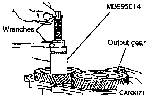 49. Install transfer shaft gear, using Gear Installer MB995014 or equivalent and two wrenches as shown.