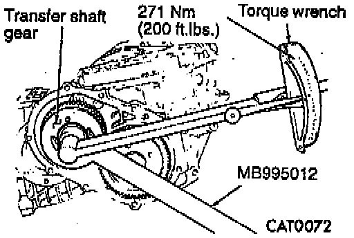 51. Tighten transfer shaft gear nut to 271 Nm (200 ft. lbs.) while holding transfer shaft gear with Holder MB995012 or equivalent.