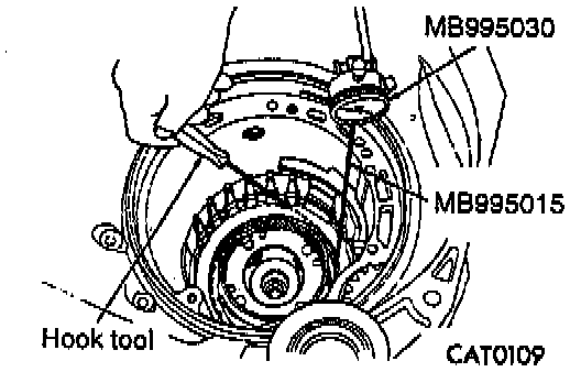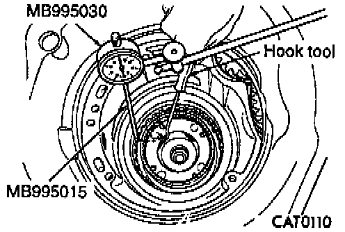 56. Check clutch clearance. Set Dial Indicator set up MB995030 with Dial Indicator Tip MB995015 or equivalents as shown. Press down on the clutch pack with finger and zero dial indicator. Raise one clutch disc with a hook tool. Read the dial indicator.