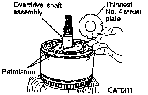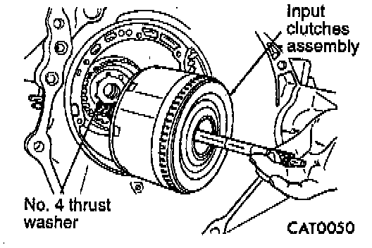 70. To determine the proper thickness of the No. 4 thrust plate, select the thinnest No. 4 "test" thrust plate. Using petrolatum to hold thrust plate in position, install input clutches assembly. Be sure the input clutches assembly is completely seated.