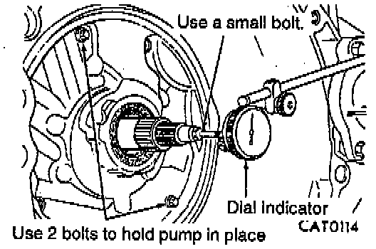 - Temporarily secure oil pump with 2 oil pump bolts. Insert a small bolt into end of input shaft.