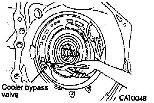 CAUTION: The cooler bypass valve must be replaced if a transaxle failure has occurred. Do not reuse or attempt to clean old valve. When installing bypass value, insert with O-ring end toward rear of case.