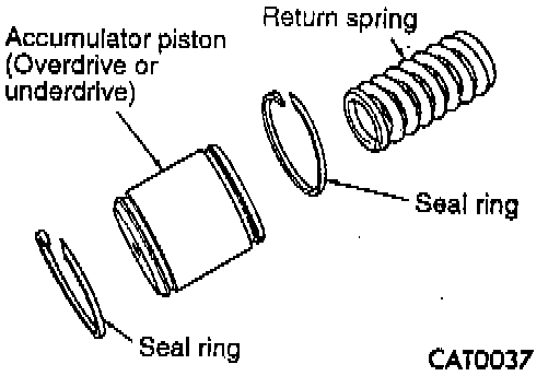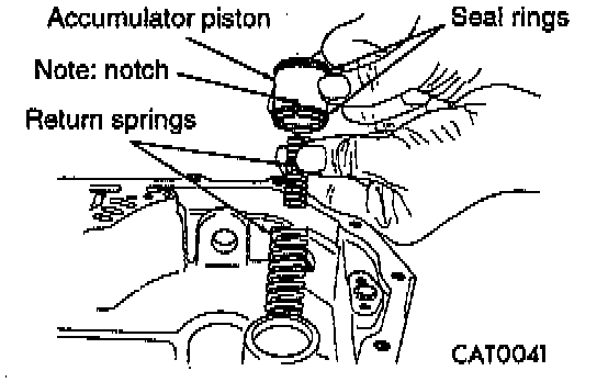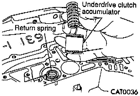 7. Remove underdrive clutch accumulator and overdrive clutch accumulator with return springs and seal rings.