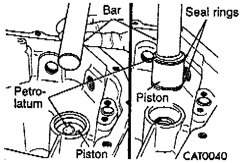 11. Put a dab of petrolatum on the top of low/reverse accumulator piston. Using a smooth-surface bar or equivalent, press the bar evenly against the petrolatum so it sticks to the piston. Pull out the piston.