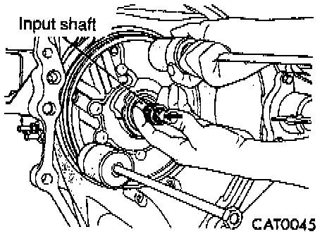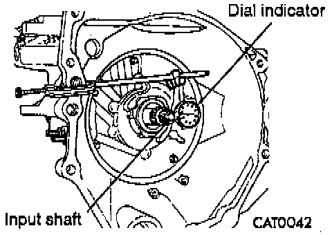 Attach a dial indicator to transaxle bell-housing with its plunger seated against end of input shaft.