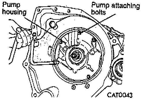 15. Remove pump attaching bolts.
