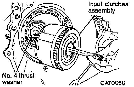 13. Measuring input shaft end play before disassembly will usually indicate when a No. 4 thrust plate change is required (except when major parts are replaced). The No. 4 thrust plate is located behind the overdrive clutch hub.