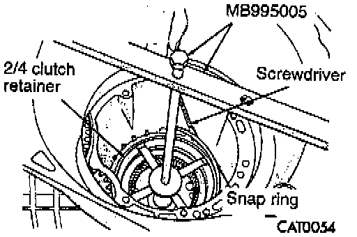 26. Install spring compressor MB995005 or equivalent. Using the special tool, compress the 2/4 clutch retainer just enough to remove the snap ring. Using a screwdriver, remove the 2/4 clutch retainer snap ring.