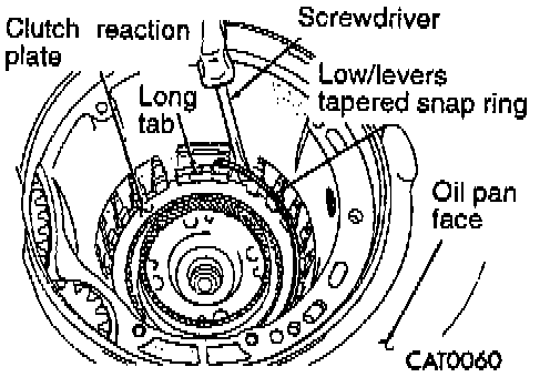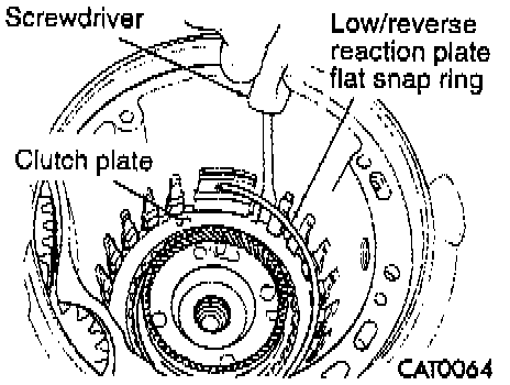 34. Using a screwdriver, pry out the low/reverse reaction plate flat snap ring.