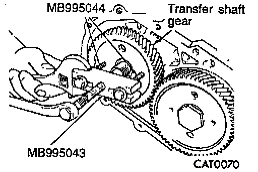 40. Install Gear Puller MB995043 and Bolts MB995044 or equivalents to transfer shaft gear. Using the appropriate wrench, turn the center bolt clockwise to remove gear.